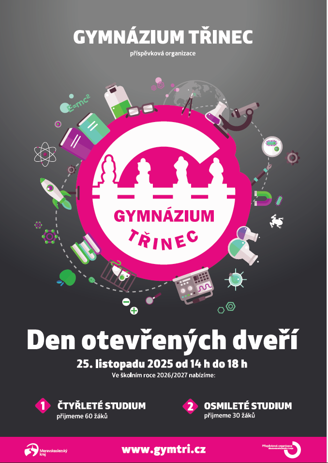 srdečně Vás zveme na den otevřených dveří na třineckém gymnáziu. Dne 25. 11. 2025 od 14:00 do 18:00 budete mít možnost si naši školu prohlédnout a zeptat se na vše, co Vás o škole a studiu zajímá.